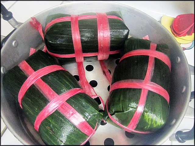 Cũng chuẩn bị một ít lá chuối, dây cột và đầu ăn để thoa lá.