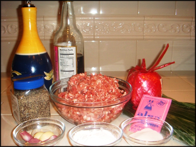 - 2 lbs. thịt heo xay ít mỡ. Nếu muốn kiểm soát lượng mỡ trong thịt có thể chọn miếng thịt vừa ý nhờ người bán thịt xay 1 lần thôi (có nhiều công thức chỉ dẫn xay 3 lần) - 2 muỗng canh nước mắm - 2 muỗng cà phê đường - 2 muỗng canh bột năng (có thể xài bột khoai của Nhật, có người cho là sẽ làm cho giò ra trắng mịn hơn) - 2 muỗng canh nước ấm - 2 muỗng canh dầu ăn - hành hương, tỏi, tiêu (nếu thích) - 1 muỗng cà phê bột nổi (baking powder) Cũng chuẩn bị một ít lá chuối, dây cột và đầu ăn để thoa lá.