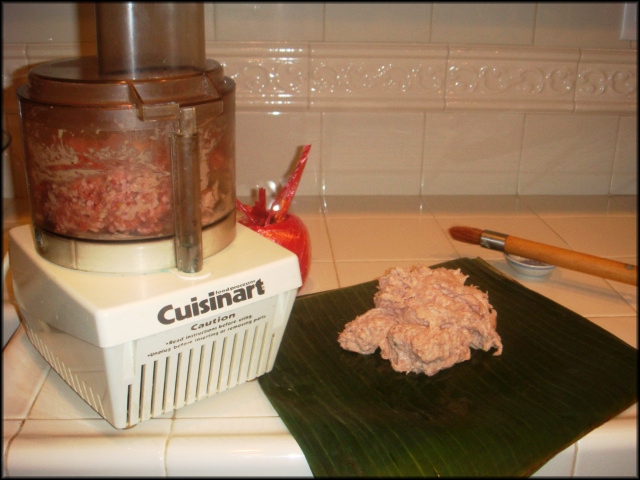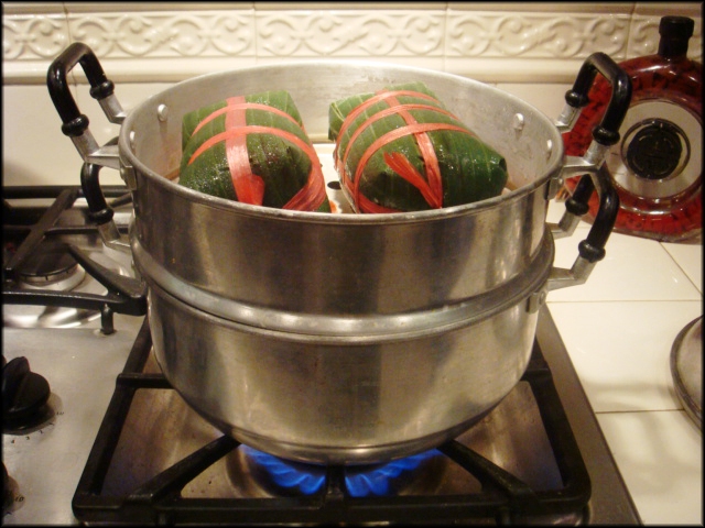 Lá chuối lau sạch, phết chút dầu ăn lên mặt xong cho giò đã xay lên, gói lại và cho vào xửng hấp chừng 45 phút là giò chín.