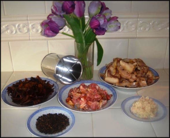 đầu heo - 1 pound thịt (heo) nạc - 1 gói nấm mèo (khỏang 2.5 oz.)