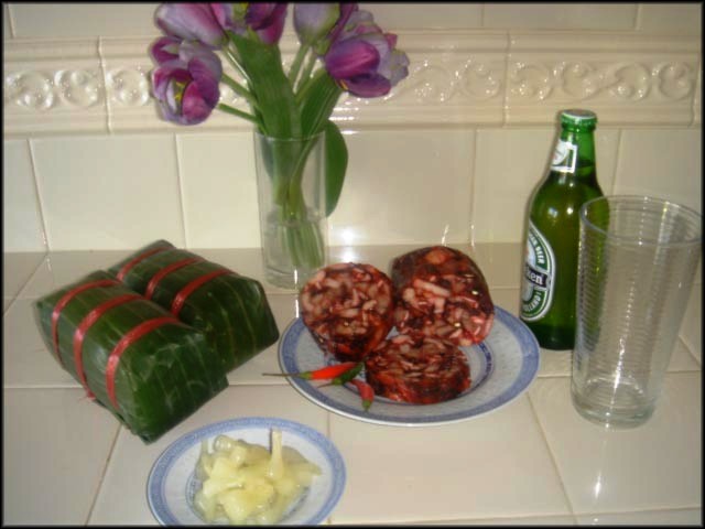 Để gói giò, dùng một bao zip lock (quart size) hay một bao ny-lon dày, để bao vào một lon trống 2 đầu cho hỗn hợp thịt trên đây vào, nén cho chặt. Dùng dây nhợ cột bao lại, nhẹ tay trút ra và bó lại thành hình như đòn giò lụa. Đem giò luộc khoảng 45 phút. Xong đem ra rửa sạch để ráo và cất vào tủ lạnh chừng 4,5 tiếng đồng hồ là được. |