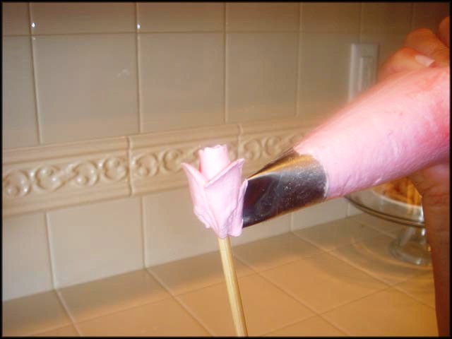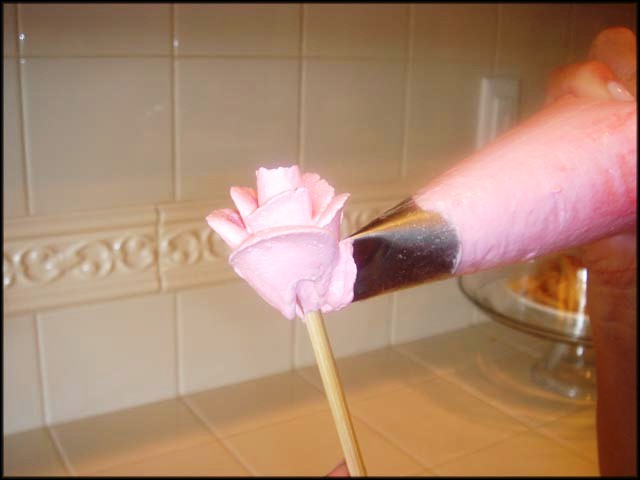 NẶN HOA HỒNG Dùng đuôi nặn hoa hồng chuẩn bị túi kem với màu theo ý thích. Cầm chiếc đũa thẳng đứng, bằng một tay, tay kia nặn một vòng kem nhỏ ngay đầu chiếc đũa, tay cầm túi kem chỉ cử động lên và xuống, tay cầm chiếc đũa quay tròn để tạo hình cánh hoa. Tiếp tục động tác này. Hoa hồng đã thành hình, dùng chiếc kéo để gắp hoa hồng ra và đặt lên bánh . Tiếp tục như vậy để làm hoa hồng. Khi đã xong hoa hồng, dùng đuôi nặn hoa hồng để làm nụ hoa, nụ hoa sẽ gồm có 3 cánh, có thể làm cánh ở giữa một màu và 2 cánh hai bên màu khác. Dùng đuôi nặn lá, chuẩn bị túi kem màu xanh lá cây, nặn lá chung quanh hoa và nụ hoa. |