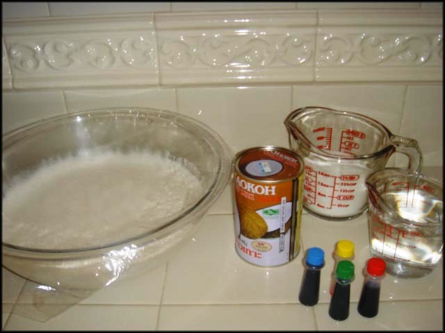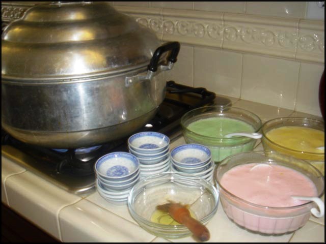 Chuẩn bị sẵn một xửng hấp và ít màu làm bánh như vành, xanh, đỏ…