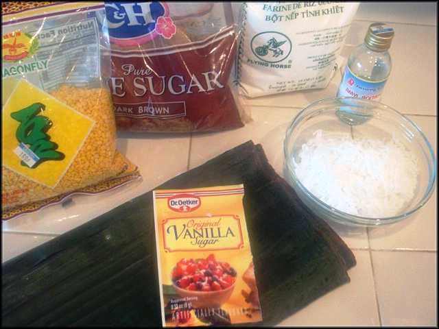 VỎ BÁNH: - 1 cup thịt gấc hoặc 1/2 cup bột gấc - 1 gói bột nếp - 3 muỗng canh bột gạo - 2 1/4 cups nước - 1 cup đường - Lá chuối