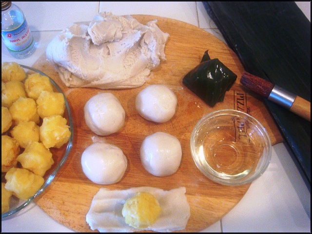 Lấy một viên bột chừng 1 inch, vo mịn, kéo bột ra thành hình chữ nhật, cho nhân vào giữa, kéo mí bột lại vo viên. Chuẩn bị miếng lá chuối vuông, gói bánh thành hình nón và đem bánh hấp 20 phút.