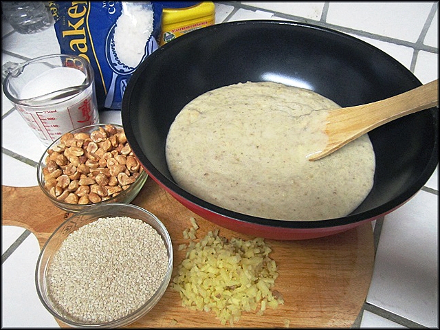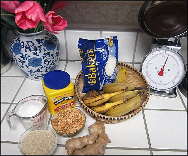 - 2 lbs chuối chin - 1 cup đường - 2 cups dừa sợi (Sweetened Coconut Flakes) - 1/2 cup bột Năng - 1 miếng gừng bằm nhỏ - 1 cup đậu phọng rang - 1 cup mè rang