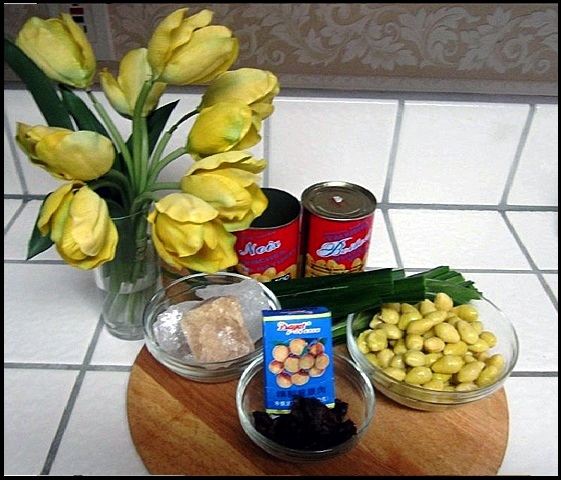 - 1 hộp bạch quả 16 oz. (nếu có bạch quả tươi càng tốt). - 2 oz. nhãn nhục - Đường phèn - Lá dứa tươi, hoặc dùng ½ giọt dầu lá dứa.