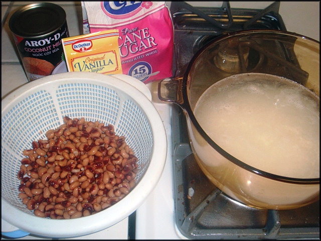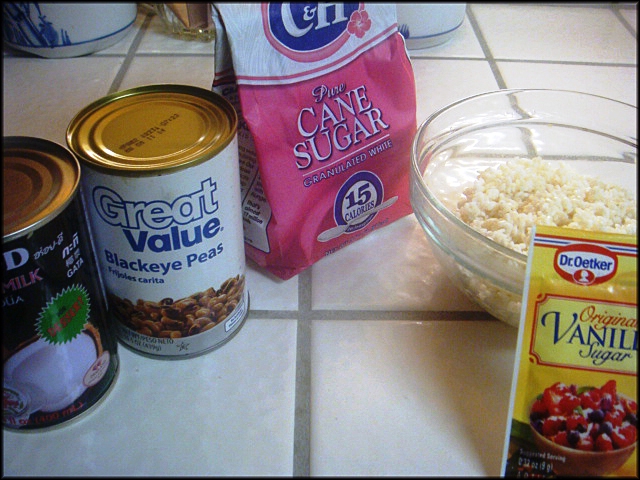 - 1 chén nếp - 1 lon đậu trắng (khoảng 12 oz.) - 1 cup đường - 1 gói bột vani - Nước cốt dừa: 1 lon nước cốt dừa + 2 muỗng canh bột gạo + 2 muỗng canh đường + 1/2 muỗng cà phê muối