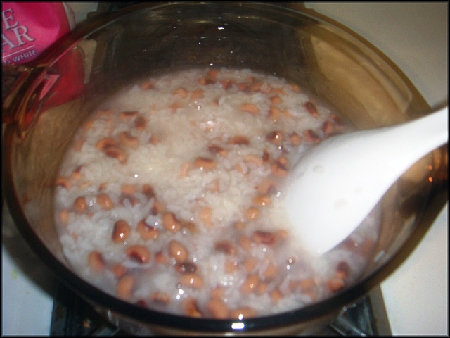 Khi nếp và đậu đã chín mềm, cho đường vào trộn đều, để nồi sôi chừng vài phút cho đường tan và thấm đều. Cho bột vani vào và tắt lửa.
