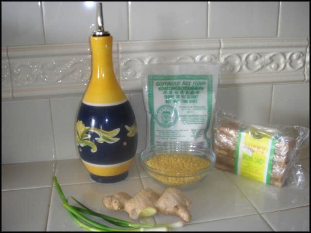 - 1 gói bột nếp - 1 gói đậu xanh không vỏ - 1 ½ gói đường thẻ 16 oz. - 1 lon nước cốt dừa - 1 ít mè rang vàng - 1 miếng gừng - Một vài cọng hành lá - Dầu ăn - Muối