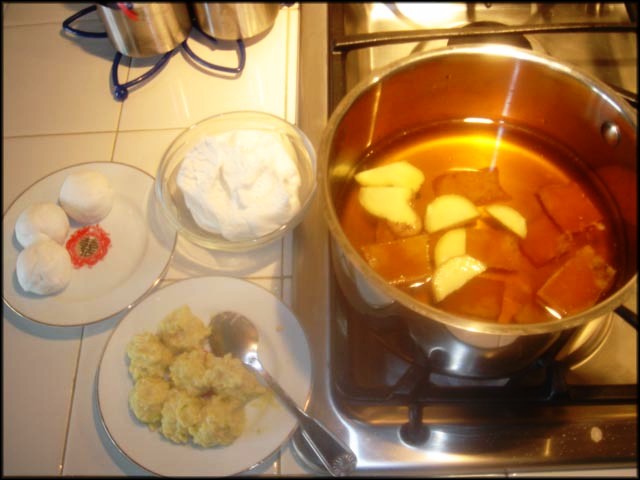 Cách làm: Đậu xanh ngâm mềm, đem nấu chín tán nhuyễn. Lấy một chảo nhỏ cho dầu ăn và hành lá vào xào cho thơm xong cho đậu xanh vào xào, nêm chút xíu muối. Để nguội vo viên chừng 1 inch. Đường thẻ nấu với nước vừa ngập với chút gừng, nồi sôi lên vặn lửa nhỏ để sôi thêm chừng năm phút, giữ nước đường ấm. Trong một thố vừa cho gói bột nếp vào nhồi với nước nóng (nếu nước nấu trên bếp, nước vừa lăn tăn bọt là được không cần sôi, nấu microwave thì mỗi cup chừng 1 phút) khi thấy bột không dính tay là được, cho thêm vào ít dầu ăn nhồi đều. |