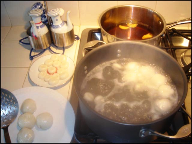 Lấy từng viên bột khỏang 1 inch, kéo thành hình chữ nhật, cho nhân đậu xanh đã chuẩn bị trên đây vào túm lại, vo viên tròn. Tiếp tục làm cho hết nhân. Bột còn lại vo từng viên nhỏ xong lấy ngón tay đè xuống ở giữa cho trũng xuống. Lấy một nồi lớn cho nhiều nước để luộc bánh trôi nước. Khi nước sôi cho bánh vào luộc, cho đến khi bánh nổi lên là được, sau đó dùng một cái vá có lỗ vớt (bột) ra để trên dĩa. Khi mặt bánh hơi ráo múc cho vào nồi nước đường. Có nhiều cách hướng dẫn khi vớt bánh ra cho vào tô nước. Ở đây chúng tôi cố tránh bánh còn ướt khi cho vào nước đường sẽ làm loãng và đục nước đường. |