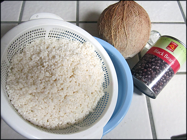 - 2 chén nếp - 1 lon đậu đen 8 oz. - 1 trái dừa (hoặc 1 lon nước cốt dừa và 1 chén dừa bào sẵn) - Muối, đường - Đậu phọng rang, mè rang