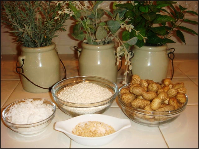 - 1 chén nếp - 1 chén đâu phọng nguyên vỏ luộc chín - Dừa bào sợi - Muối, đường - Mè rang