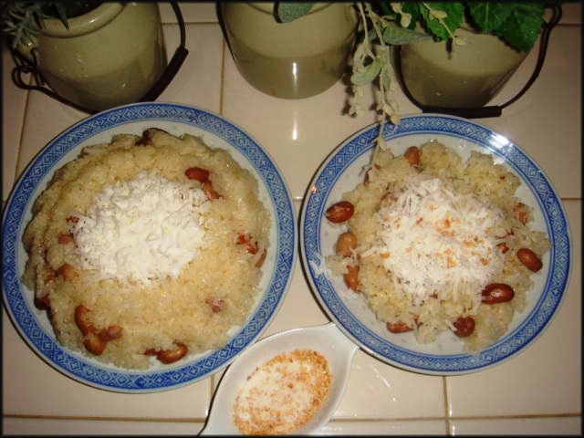 Xôi chín xới ra dĩa cho dừa bào lên rắc ít muối mè lên trên mặt. Các bạn sẽ có một dĩa xôi thơm ngon giản dị như khi còn ở quê nhà. |