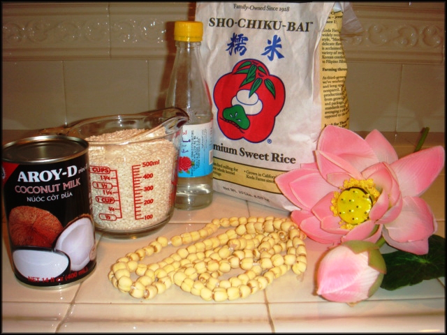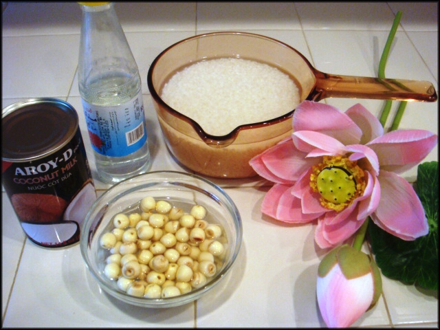 - 2 cup nếp - ½ cup hột sen khô (3/4 cup hột sen tươi) - 1 lon nước cốt dừa - 1 ít nước hoa bưởi hay nước hoa hồng - 1 vài giọt màu vàng (không xài màu cũng được) - 1 muỗng canh bột năng - Muối