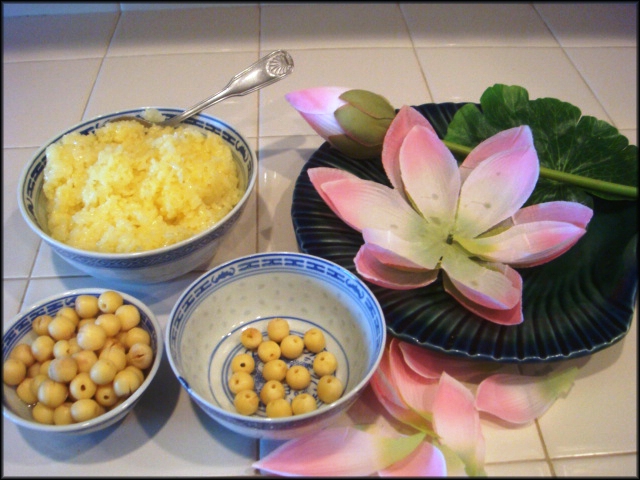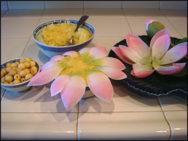 Cũng chuẩn bị một ít cánh hoa sen để trang trí dĩa xôi, nếu có hoa tươi thì tốt (ở Việt Nam), các bạn cũng có thể dùng hoa vải và để dành xài nhiều lần.