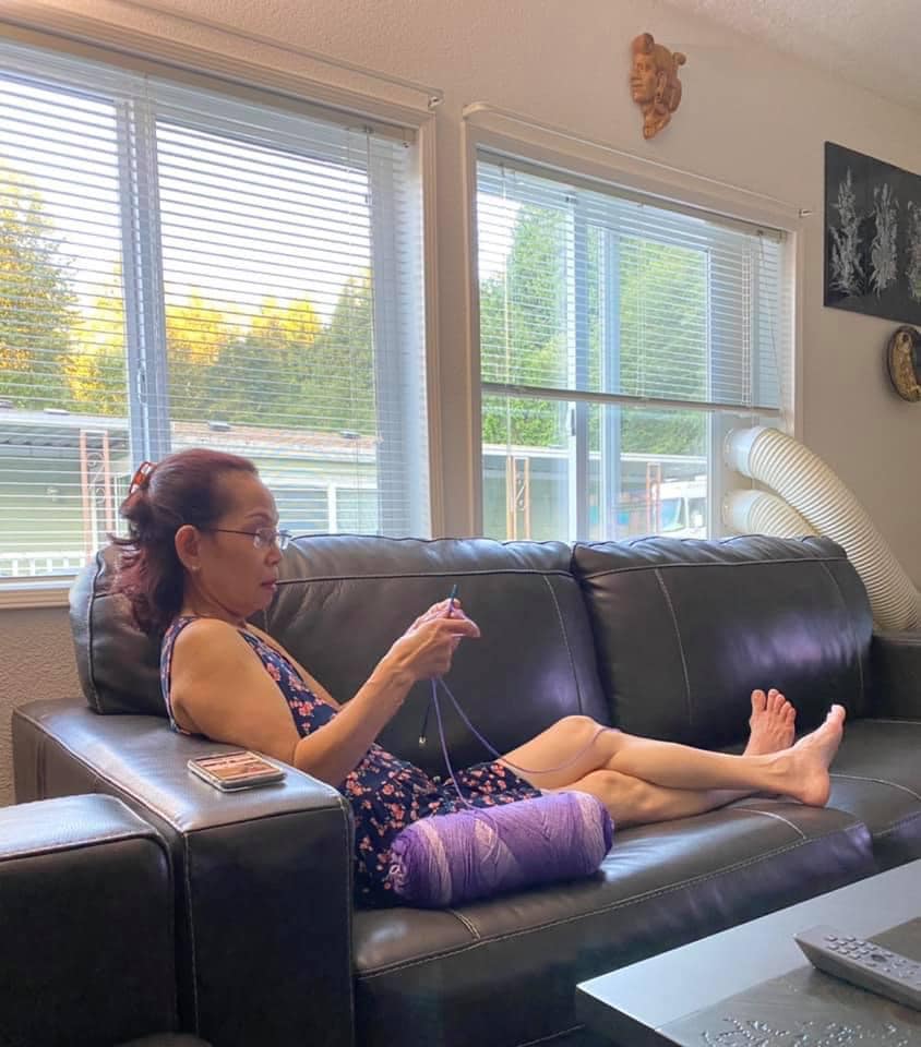 Hình ảnh người phụ nữ ngồi trên sofa cặm cụi đan áo, trong căn phòng