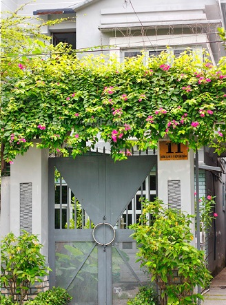 kín tường cao, nếu không nhờ giàn ti gôn leo lên thành thì tôi thấy căn