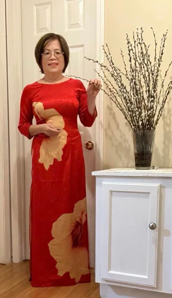 Tôi bỗng thấy một tấm hình của Anh Trinh trong chiếc áo dài đỏ, mẫu áo