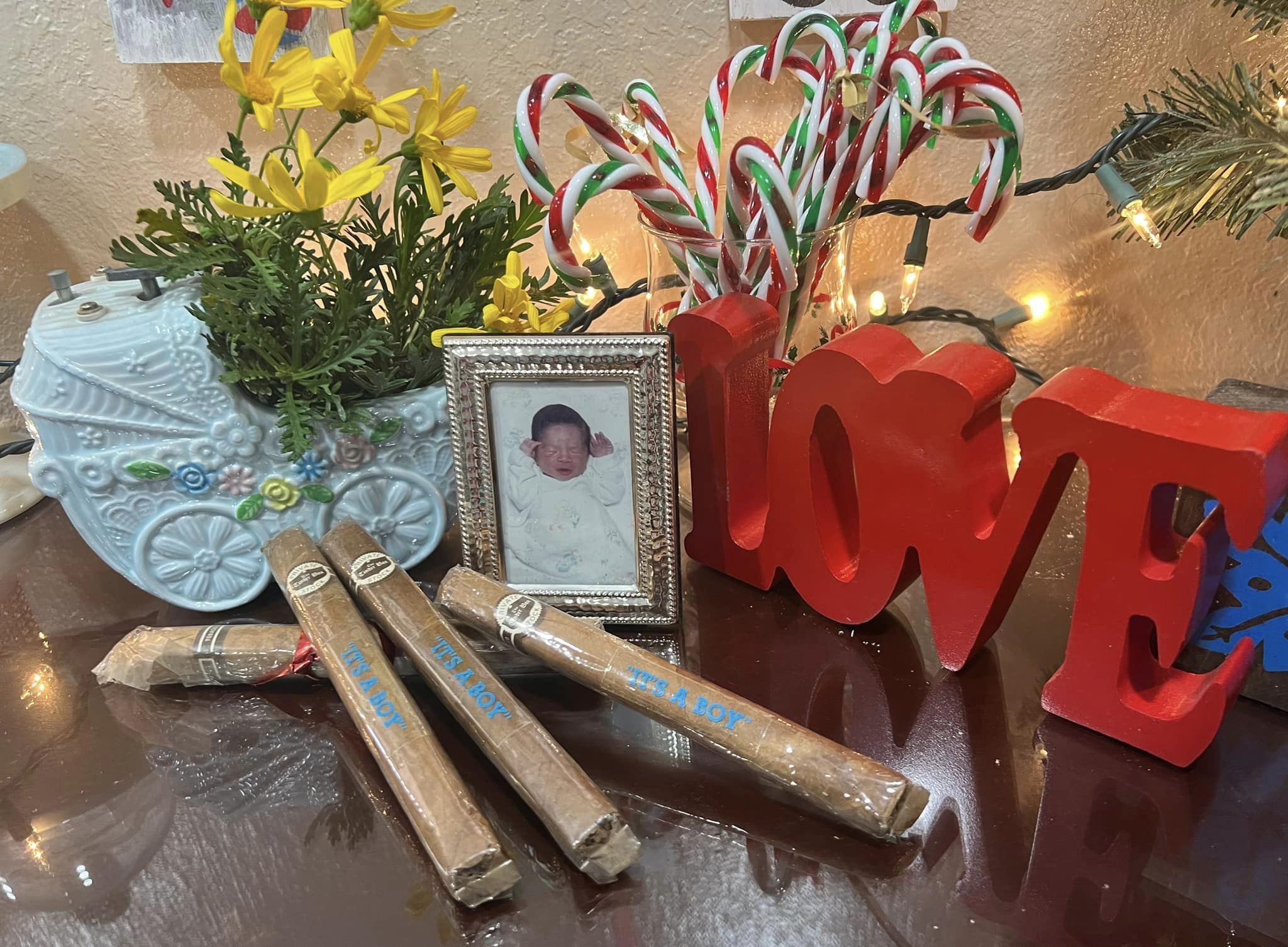 trên tay, ngồi loay hoay dán nhãn “It’s a boy” lên điếu cigar để tặng và