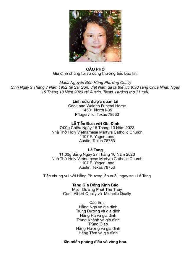 Hay tin trễ Người Chị Khóa I * Cựu Nữ Sinh NK 70-71 Chị NGUYỄN ĐÔN HẰNG PHƯƠNG Đã ra đi ngày 15 tháng 10 năm 2023 tại Austin, Texas - USA Hưởng Thọ 71 tuổi. |