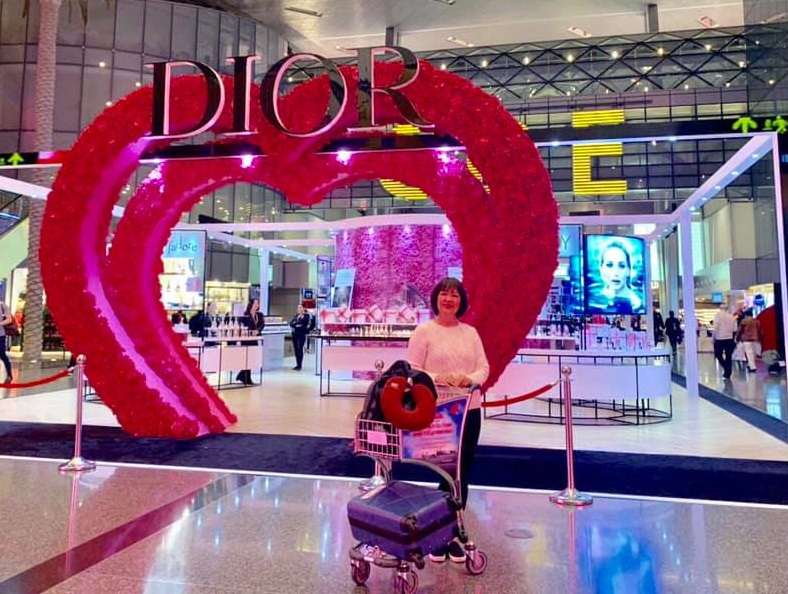 TH tươi cười đứng bên chiếc xe đẩy va li ở phi trường... Bon voyage, TH!